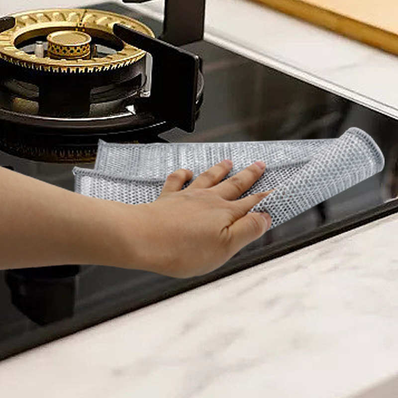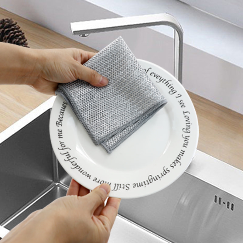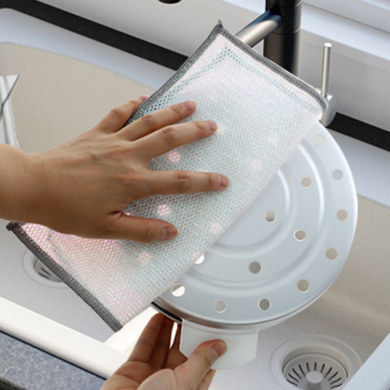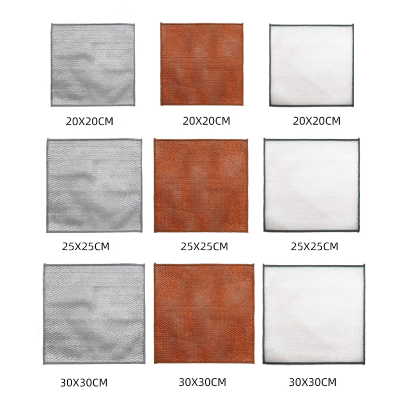 Khăn rửa chén hai mặt bằng dây bạc, Được làm bằng lụa đồng, rất đắt tiền; Không phủ, không bột, không phai màu; Không dầu, không dầu, cạo mạnh nhưng không làm hỏng dụng cụ nấu. Được làm bằng lụa nhiều màu sắc, nhờn và không dính, có giá trị thẩm mỹ cao; Không có lớp phủ, không bị rơi bột, không bị phai màu; Cạo mạnh nhưng không làm hỏng dụng cụ nấu.