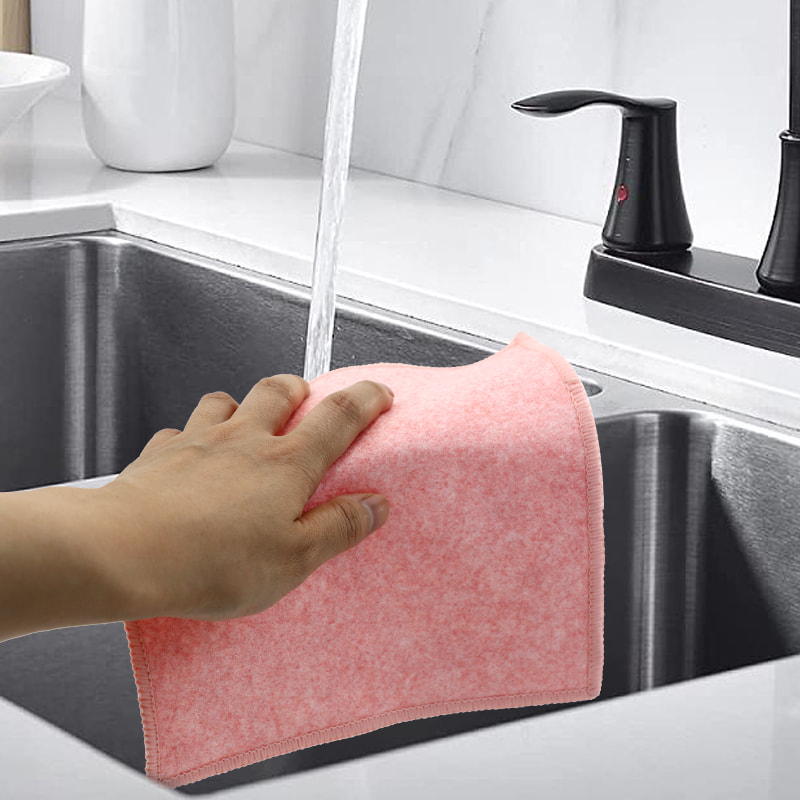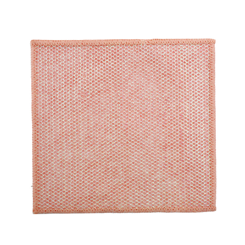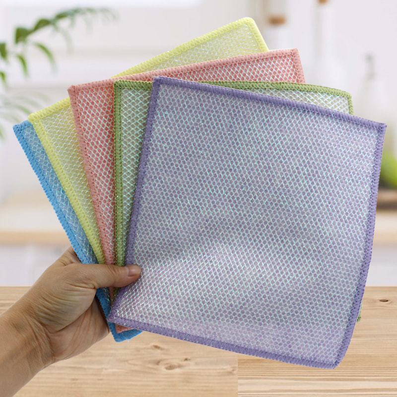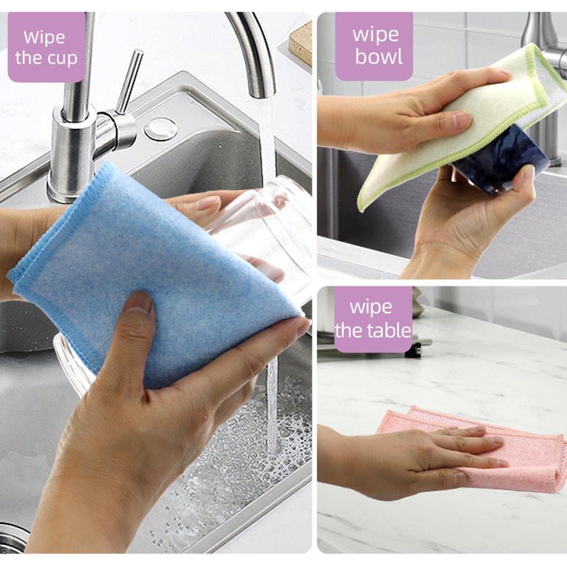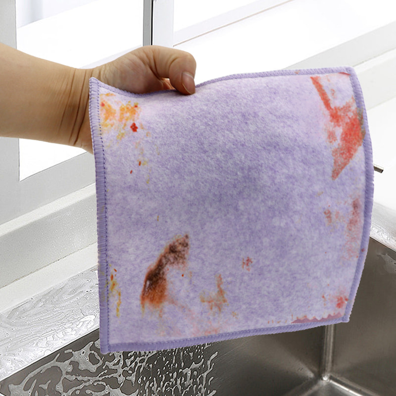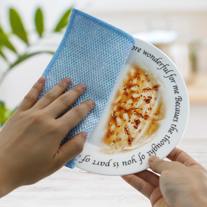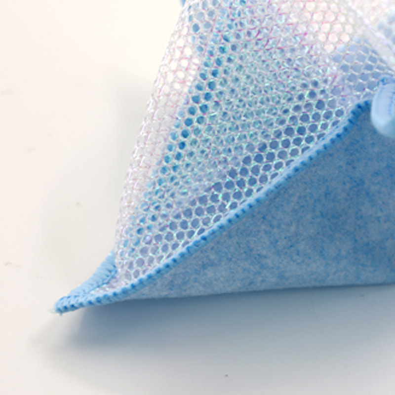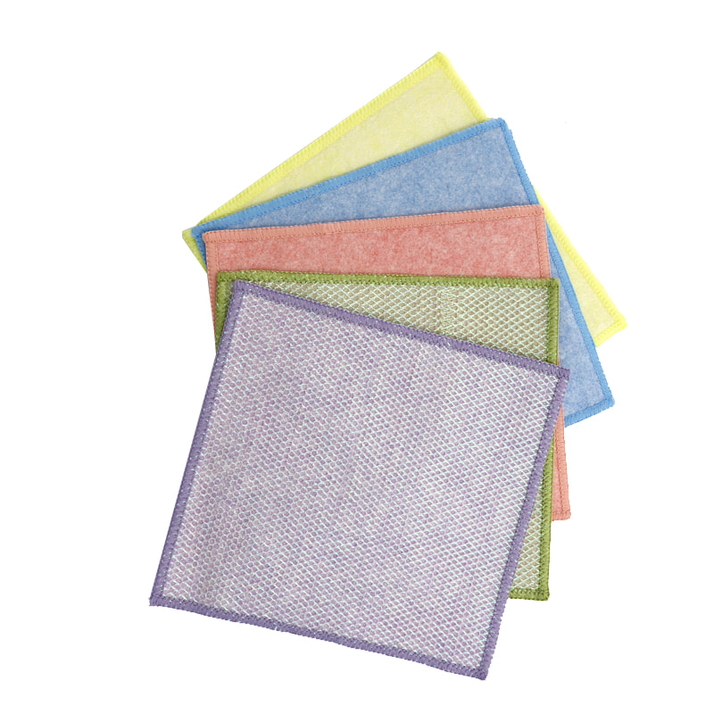 Cấu trúc hình dạng đặc biệt, nhiều màu sắc, hình thức cao; Một mặt là vải lau nhiều màu sắc có khả năng cạo mạnh, mặt còn lại là vải lưới, đáp ứng chức năng kép là làm sạch trong khi cạo; Không chứa dầu và có khả năng hút nước mạnh. Một mặt được dệt bằng lụa nhiều màu sắc với nhiều hoa văn khác nhau, mặt còn lại là bề mặt vải viscose không thấm dầu và thấm nước, rất đẹp và có thể đáp ứng cả chức năng kép là chà và chà một mặt.